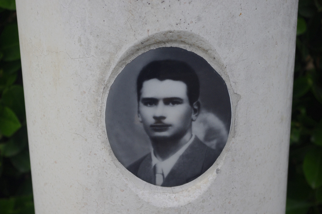 - Basamento quadrato di pietra bianca, con sovrapposto un secondo blocco lavorato con incisioni, culminante con una colonna bianca con incisioni e fotografia.