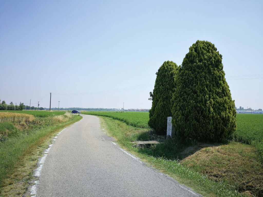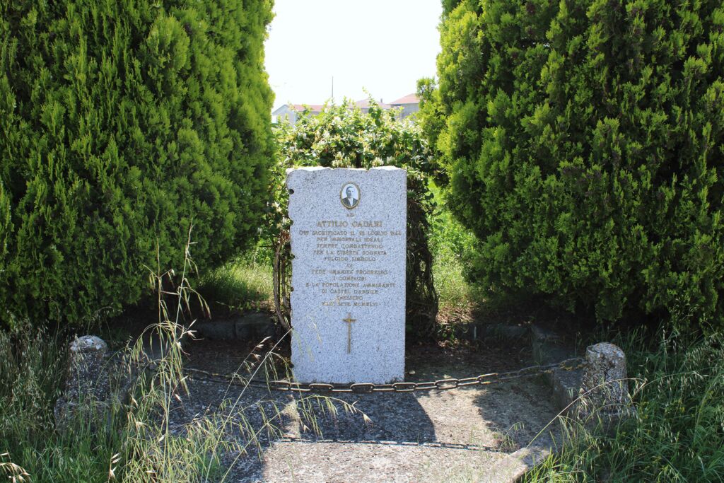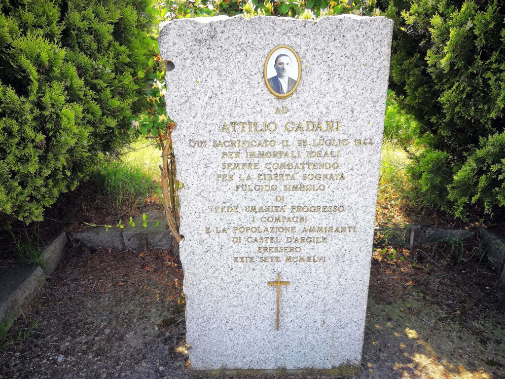 Nella notte tra il 25 ed il 26 Luglio 1944, per rappresaglia ad un’azione partigiana, i fascisti uccisero a Venezzano di Castello d’Argile due uomini attivi nel movimento resistenziale. Uno di questi era Attilio Gadani. Il cippo a lui dedicato è stato eretto in un’apposita superficie ricavata lungo il margine di Via Alpa. Inaugurato originariamente il 29 Settembre 1946, è stato sostituito con quello attuale, conservandone l’epigrafe. Il cippo è costituito da una spessa lastra di granito di forma rettangolare. Il lato superiore e quello laterale sinistro (rispetto a chi guarda) si presentano con i bordi leggermente frastagliati. Quello destro ha delle incisioni che ricordano un ramo di foglie, forse di alloro. Sulla parte frontale è stata composta l’epigrafe mediante caratteri di bronzo in rilievo. Questa riporta il nome del Caduto, la data di morte e quella della prima posa, nonché i committenti dell’opera. Sulla parte superiore della lastra, in posizione centrale, è stato collocato il fotorirattto in ceramica del Gadani, racchiuso in una cornice ovale di bronzo. Sotto l’epigrafe, sempre in posizione centrale, si trova una sottile croce cristiana in rilievo realizzata in bronzo. Il cippo poggia su una piccola area di cemento che scavalca un canale di scolo, delimitata per tre lati da un cordolo formato da blocchi di pietra. Ad entrambe l’estremità anteriori del cordolo si trova un pilastrino in pietra che tende una catena di protezione formata da robuste maglie di ferro. Completa la descrizione del sito la presenza di due alberelli di pianta sempreverde collocati ai fianchi del cippo.