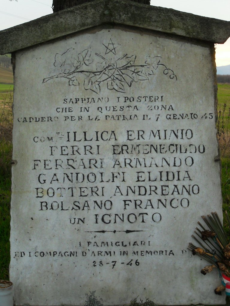 - Sappiano i posteri che in questa zona caddero per la patria il 7 gennaio 1945. Comandante Illica Erminio, Ferri Ermenegildo, Gandolfi Elidia, Botteri Andreano, Bolsano Franco, un Ignoto. I familiari ed i compagni in memoria 28/07/1946