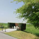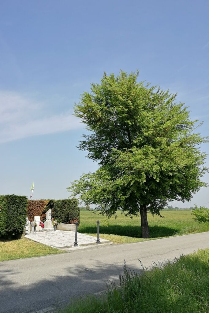 - Marmo per l'intero complesso e per la base su cui poggia il vaso portafiori. Graniglia di pietra per la pavimentazione dell'area sui cui è collocato il cippo. Cemento per il retrostante muretto di protezione. Metallo argentato per il vaso portafiori. Ferro per i due paletti antistanti l'area. Il manufatto, interamente in marmo ed a pianta rettangolare, è costituito essenzialmente da un cartiglio su cui è incisa l'epigrafe. Questa riporta in ordine alfabetico i nomi dei quattro Caduti, ciascuno con la propria età e la data dell'eccidio. I caratteri sono stati riempiti con vernice di color nero che il trascorrere del tempo ha parzialmente eroso. La struttura che contiene il cartiglio ha scolpite in bassorilievo, su entrambi i fianchi, due piccole croci greche e, sotto di esse, dei motivi floreali.
