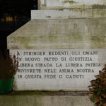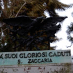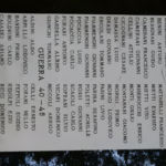 - In alto sul marmo, una corona stilizzata si forma con un sottile ramoscello colorato di rosso. In cima al monumento opera artistica in ferro battuto con un’aquila su di una spada e l’asta di una bandiera incrociate.