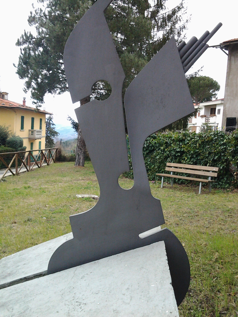 - Il cippo è realizzato in colata di calcestruzzo di forma rettangolare sulla quale in caratteri in bronzo è stata composta l'epigrafe.Due altri blocchi di calcestruzzo sostengono un manufatto in metallo dalla forma assai emblematica .