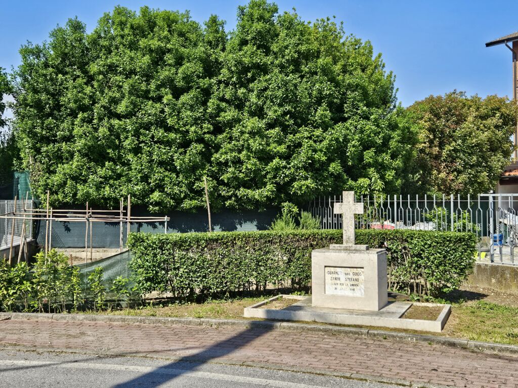 Il cippo è dedicato a due partigiani caduti nel territorio di Gadesco Pieve Delmona il 26 Aprile 1945, il medico condotto Guido Guarneri e lo studente Stefano Zanini. Si trova in un’apposita area realizzata lungo il margine della strada. Interamente in marmo, è costituito da un altare su cui poggia una croce cristiana. L’altare, a pianta rettangolare, ha inserita nella sua parte frontale una lapide, anch’essa di forma rettangolare, su cui è incisa la semplice epigrafe. Questa riporta i nomi dei due Caduti, disposti in ordine alfabetico e la comune data di morte. I caratteri sono stati rivestiti con vernice di colore nero. La croce si trova al centro dell’altare, sopra una base a pianta rettangolare. Il cippo poggia su un basamento rettangolare di marmo con due incavi della stessa forma che, nelle intenzioni, dovrebbero permettere l’inserimento di piante decorative. Dietro il cippo è stata piantata una siepe di sempreverde.