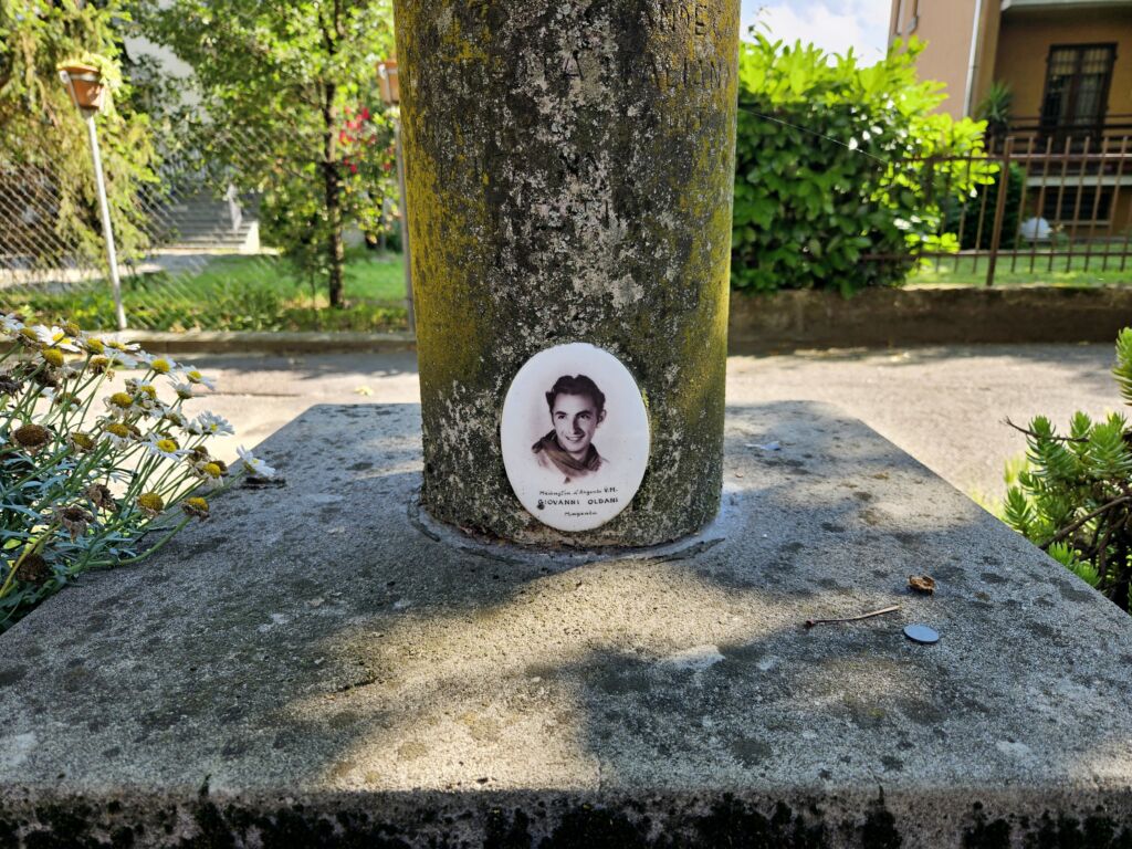 Giovanni Battista Oldani, nome di battaglia “Salvato”, già milite del 52° Corpo dei Vigili del Fuoco di Milano, era un partigiano originario della provincia di Milano, appartenente alla 31a Brig. Garibaldi “Forni” (Divisione Garibaldi “Val Ceno”) caduto in combattimento presso il Campo sportivo di San Lazzaro, a Fidenza, il 24 Aprile 1945. Circa i suoi dati ci sono diverse discrepanze: secondo la banca dati dei Caduti partigiani presente sul sito dell’Istituto Storico della Resistenza e dell’Età contemporanea di Parma il nome di battesimo è quello di Battista, nato il 10 Aprile 1926 a Magenta (Mi); nella scheda biografica dell’Anpi Provinciale di Milano è indicato come Giovan Battista Oldani, nato il 10 Aprile 1925 e caduto in combattimento il 24 Aprile 1945 a Salsomaggiore (Pr); nel fotoritratto inserito sul cippo figura come Giovanni Oldani; infine, nel ricordino funebre fatto stampare dai familiari e quindi il più attendibile, il nome riportato è quello di Giovanni Battista, con data di nascita 10 Aprile 1926 a Magenta e data di morte 24 Aprile 1945 a Fidenza. Non ho trovato informazioni sul perché sul cippo sia inciso come nome di battesimo quello di Giorgio.