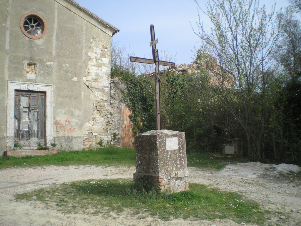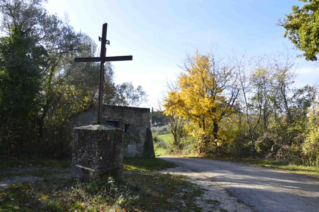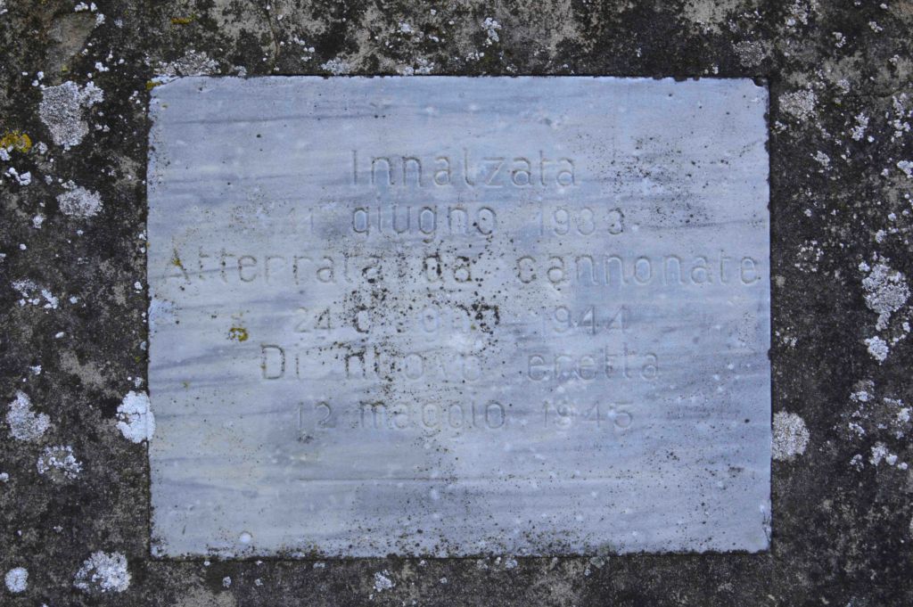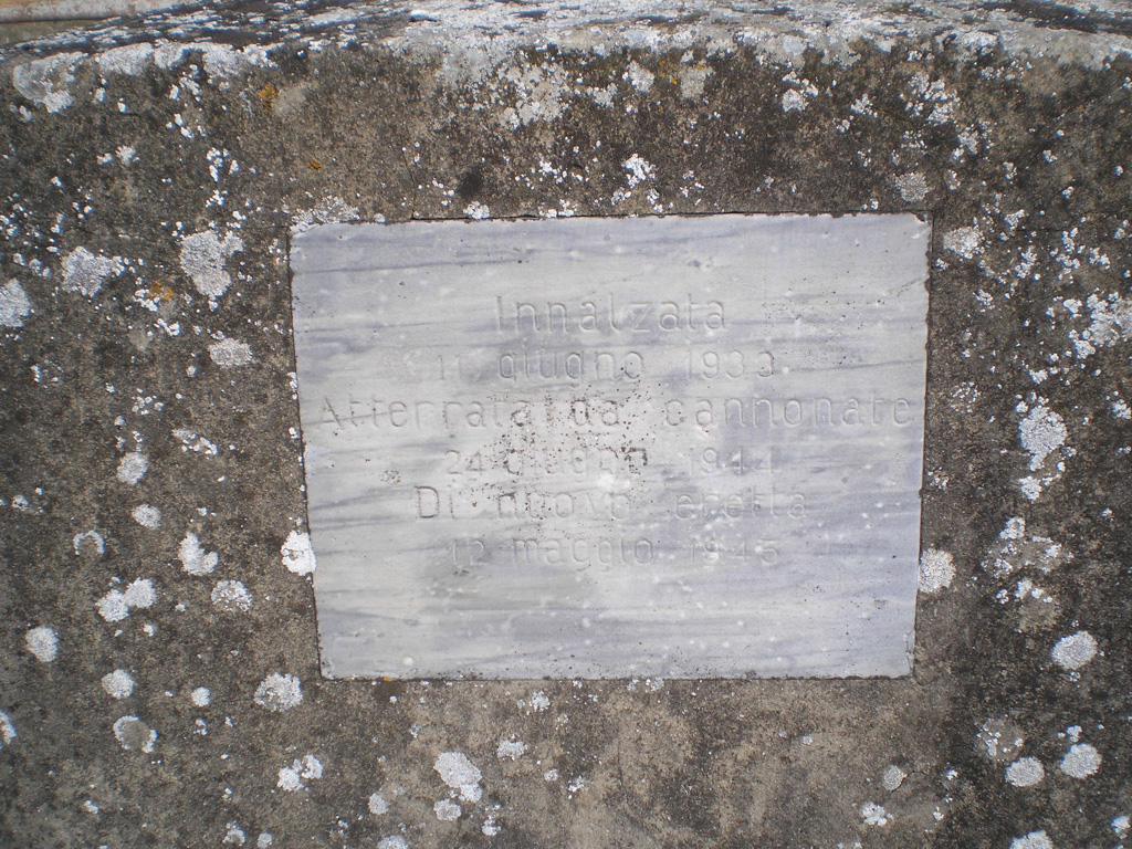 - Il motivo della costruzione di questa croce non è conosciuto ma dalla scritta si capisce che è stata distrutta da bombardamento nel 1944 e quasi subito ricostruita (1945).