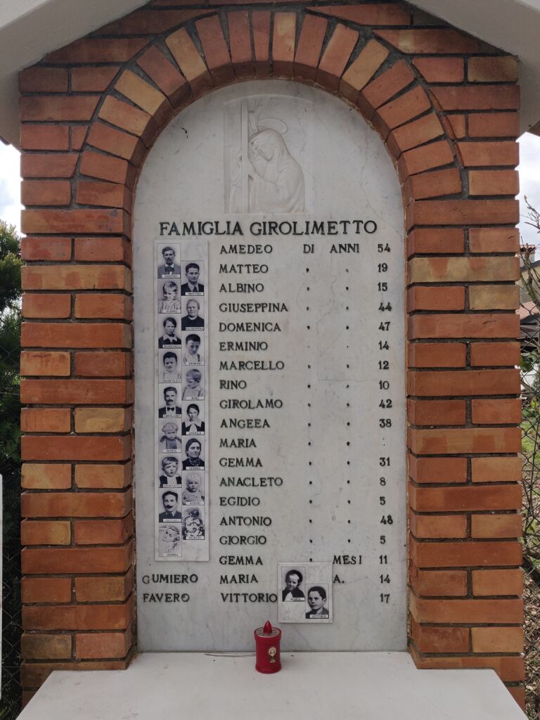 - La lapide con i nomi della famiglia Gerolimetto è coronata da un bassorilievo che rappresenta la Madonna che piange ai piedi della Croce di Gesù. Nel campo della lapide, a sinistra dei nomi dei defunti, si trovano le loro 19 fotografie. A sinistra del monumento è presente una lastra in marmo con un'incisione affigurante dei fiori.
