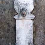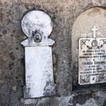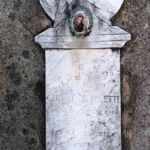 - Lapide formata da una lastra di marmo sagomata a rappresentare un'ara al di sopra della quale è presente un bassorilievo con vari simbolismi. L'iscrizione è incisa e verniciata con inchiostro nero, oramai tutto dilavato. Piccola cornice bronzea, di forma ovale, per la fotoceramica.