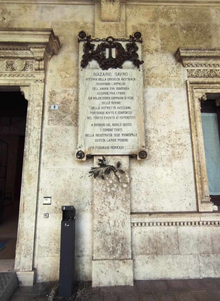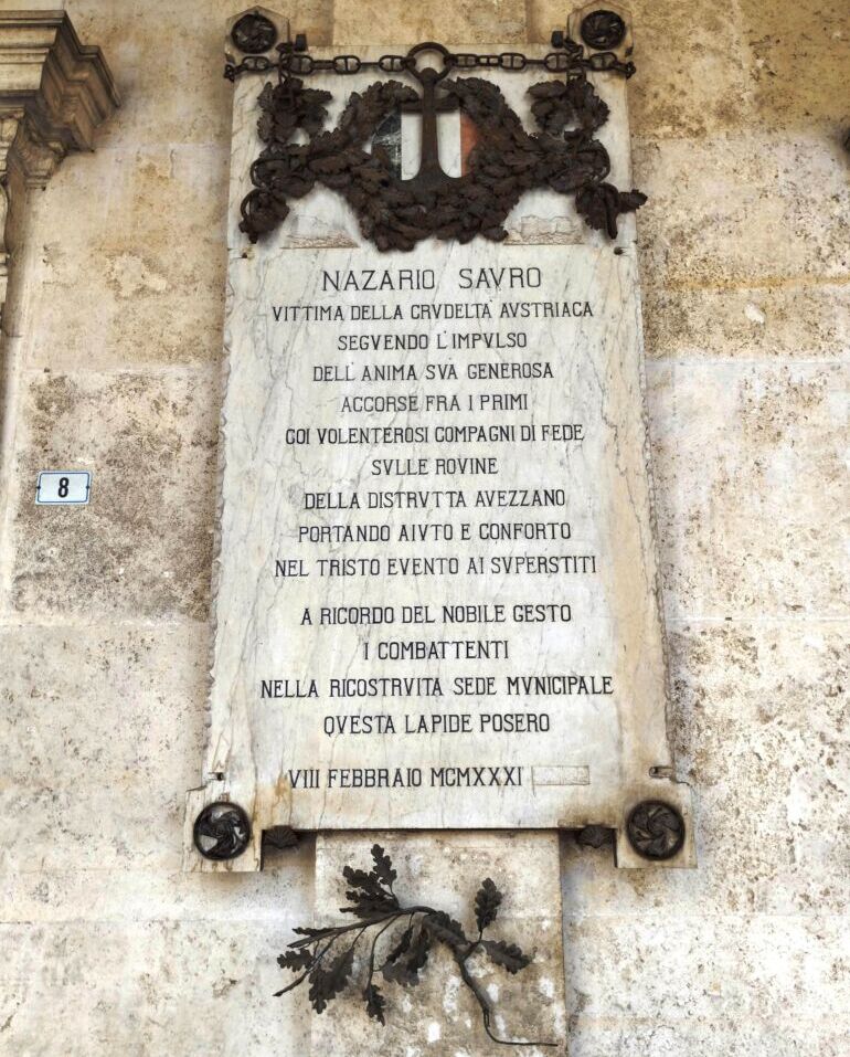 Lapide posta dagli avezzanesi combattenti della Grande Guerra per onorare la memoria del patriota Nazario Sauro martire per la sua fede irredentista. Egli fu tra i primi ad arrivare ad Avezzano per portare soccorso alla popolazione sinistrata all’indomani del terribile terremoto della Marsica del 13 gennaio 1915.