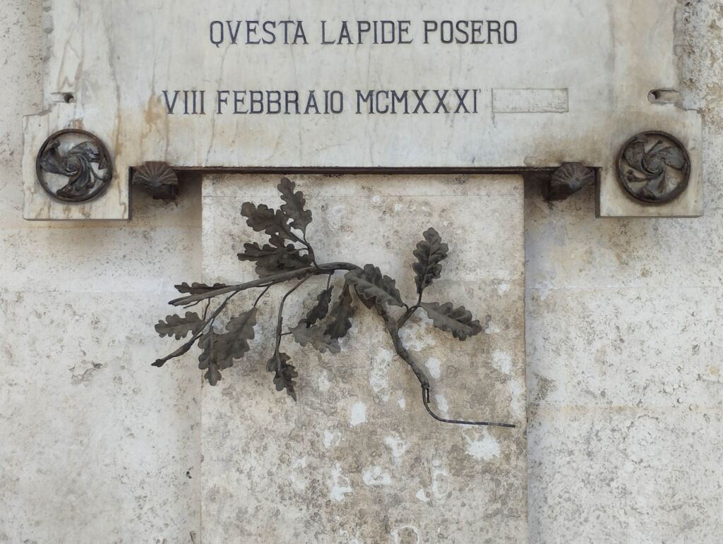 Agganciato sotto la lapide c'è un ramoscello di quesrcia in bronzo.