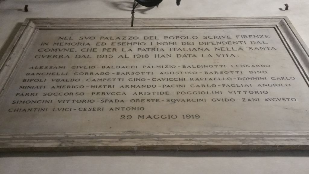 La lapide marmorea, con cornice in rilievo, venne affissa ad solo un anno dalla fine della prima guerra mondiale. Ricorda i Caduti che erano dipendenti del Comune di Firenze, che partirono e morirono durante la guerra.