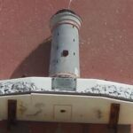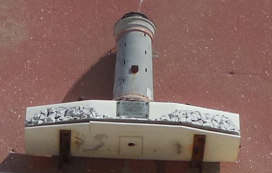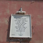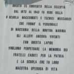 - La lapide è in pietra d’Istria, con lettere metallici, il modello del faro in alto di metallo?, su mensola di cemento; la fiorieria di bronzo