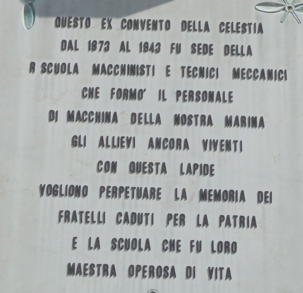 - L’ex convento di monache cisterciense di Santa Maria della Celestia, soppresso all’inizio dell’ottocento, e inglobato nel complesso dell’Arsenale. Nel 1867 fu creato la Regia Scuola Macchinisti, diventato dal 1912 Regia Scuola Meccanici, soppressa nel 1943.