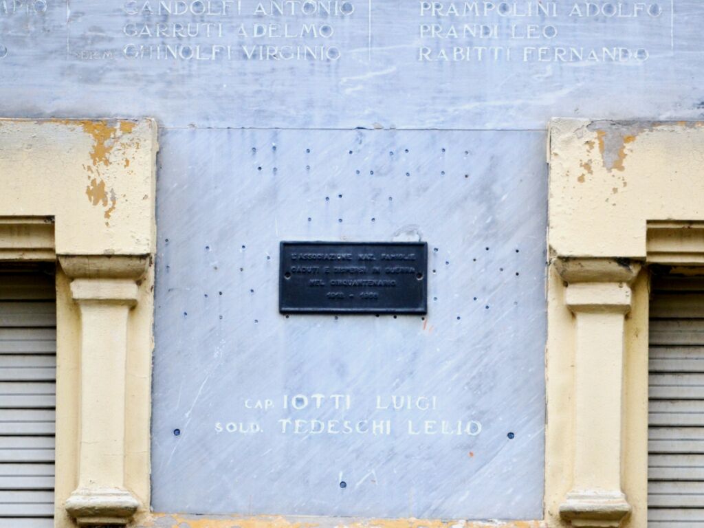 Nella parte bassa della lapide ci sono due nominativi che non risultano negli elenchi caduti della prima e della seconda guerra mondiale. Si può ipotizzare che siano caduti delle guerre in Africa o in Spagna.