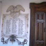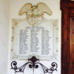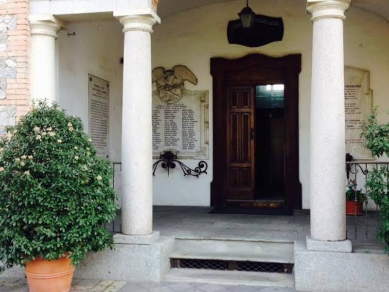 - La lapide è in marmo bianco, come la cornice e l’aquila sovrastante; nella zona inferiore si trova un porta fiaccola in bronzo.La lapide, propone un modello molto sfruttato nelle sedi comunali: una semplice lastra , con una cornice geometrica completata da motivi arricciati, sormontata da un’aquila. L’uccello ha le ali aperte, gli artigli sono appoggiati su rami di alloro e di quercia, quindi su armi da fuoco (cannone, fucile) e armi da taglio (spada).