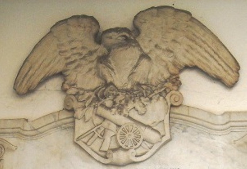 L’uccello posa gli artigli su foglie di alloro, simbolo della gloria, sotto alle quali si trovano i simboli della guerra, le armi da fuoco e da taglio rappresentate dal cannone, dal fucile, dalla spada.