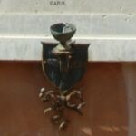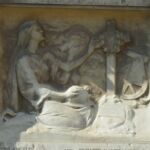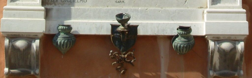Rilievo di marmo di Carrara, il resto di pietra d’Istria; due lampade e lo scudo di bronzo, una lampada di bronzo e ferro