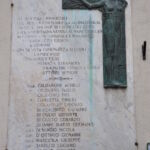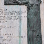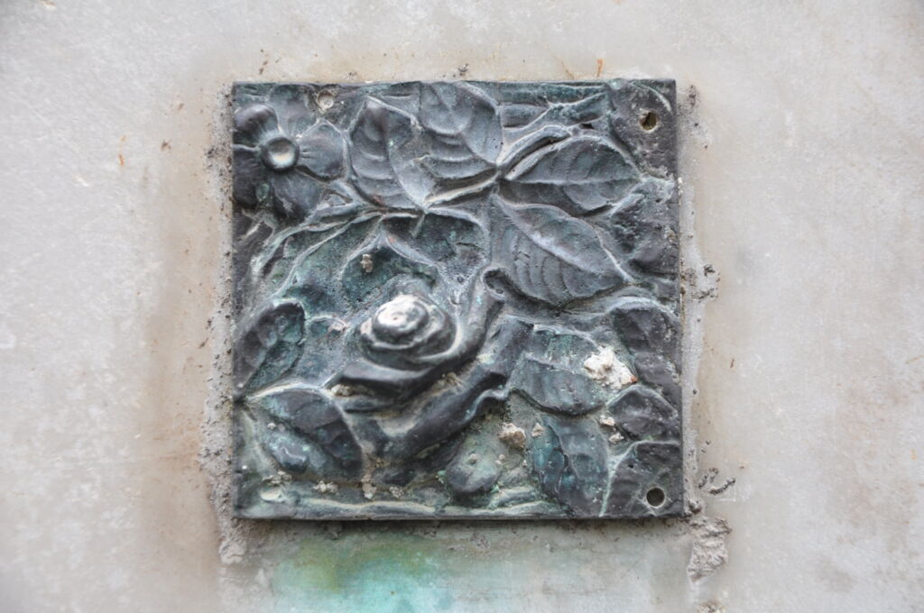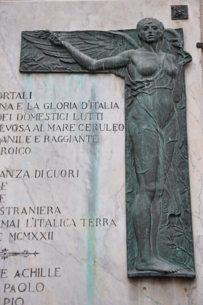 - Sulla lastra di bronzo in primo piano è presente una figura femminile classica alata, ricoperta da un drappo velato, raffigurata in posizione a 3/4 con un ramo di ulivo nella mano sinistra. La figura della donna con le ali rappresenta presumibilmente la Vittoria Alata, simbolo classico di celebrazione e commemorazione dei caduti. Inoltre sono presenti sullo sfondo ramoscelli di ulivo.