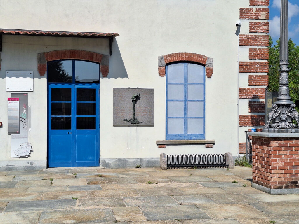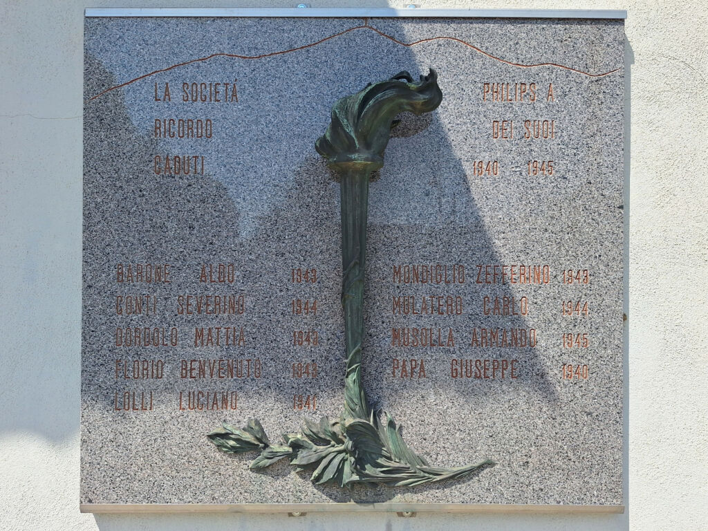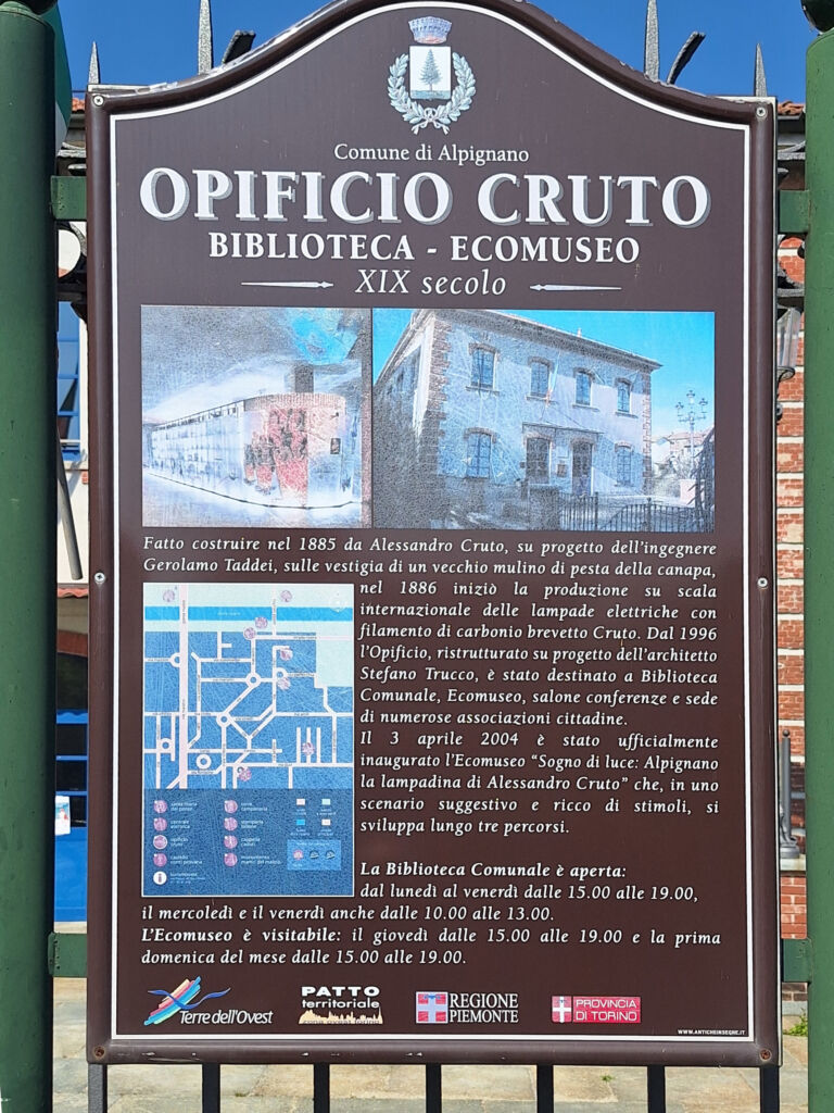 - L'opificio Cruto, edificio su cui è posta la lapide, era in origine un vecchio mulino di pesta della canapa ed è attualmente sede della Biblioteca Comunale e dell'Ecomuseo "Sogno di Luce". Fu sede dal 1886 della omonima fabbrica su scala internazionale di lampadine elettriche con filamento di carbonio, su brevetto dell'inventore piemontese Alessandro Cruto. L'industria, in seguito a numerosi passaggi di proprietà e un fallimento, venne rilevata dalla Philips nel 1927.