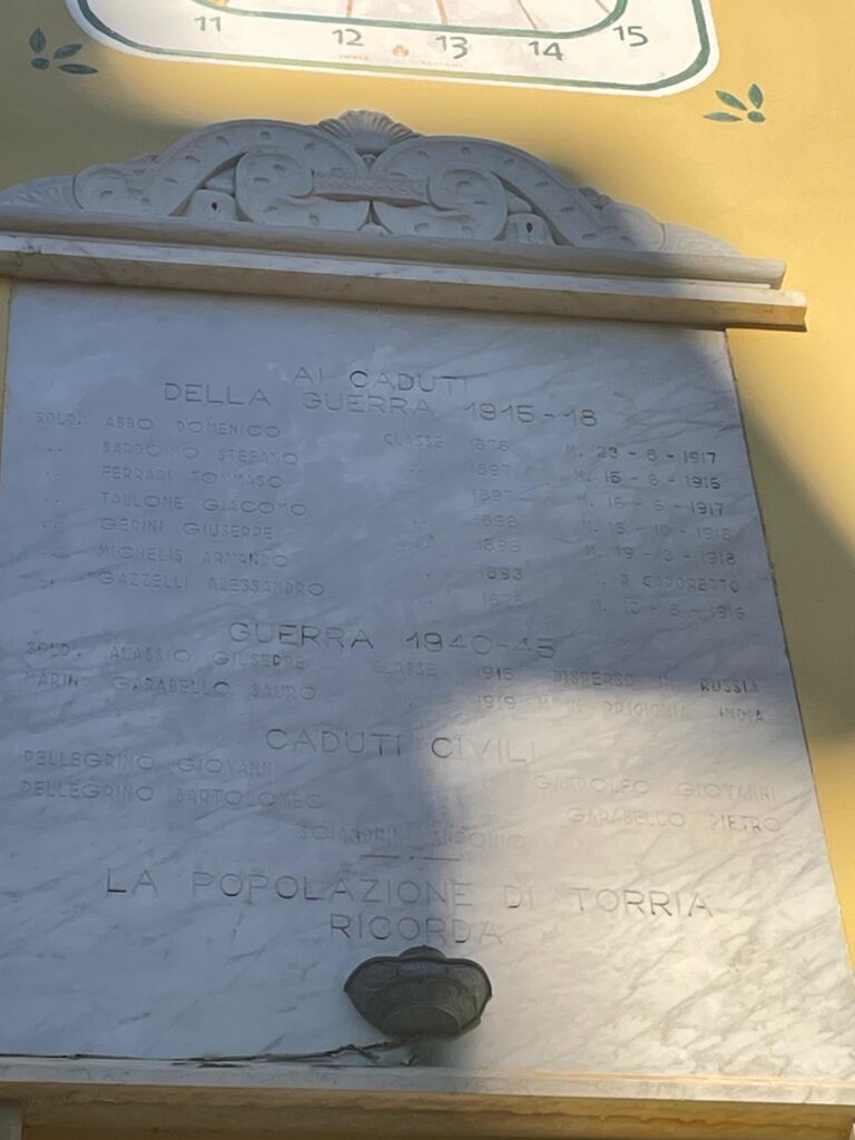 Giovanni Pellegrino è stato ucciso a Torria in data 30/07/1944, davanti a casa sua. Aveva incontrato alcuni soldati tedeschi che stavano facendo una ronda nel paese. Mise le mani in tasca, dove teneva delle noci, con l'intenzione di offrirle loro. Questo gesto, secondo quanto dichiarato dai soldati, fu scambiato per una minaccia. I tedeschi pensarono che volesse estrarre un'arma e quindi gli spararono.