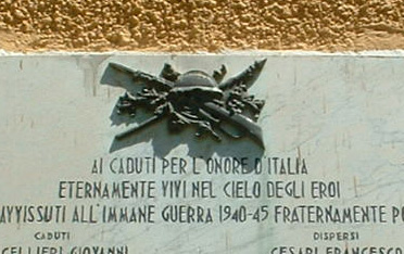 - In alto, al centro, un fucile ed una lancia incrociati con sopra un elmetto e intorno dei rami con foglie. E' presente una lampada votiva.