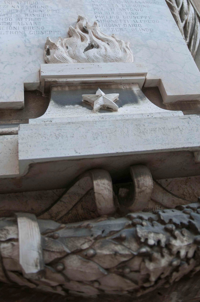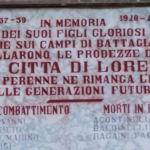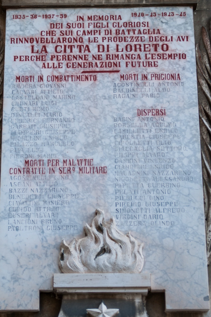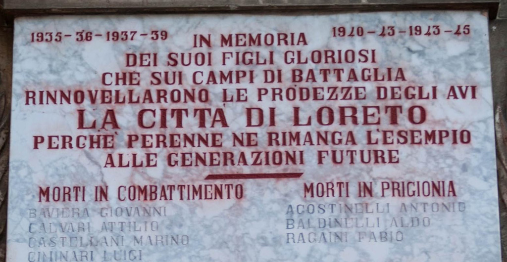IN MEMORIA / DEI SUOI FIGLI GLORIOSI / CHE SUI CAMPI DI BATTAGLIA / RINNOVELLARONO LE PRODEZZE DEGLI AVI / LA CITTÀ DI LORETO / PERCHÉ PERENNE NE RIMANGA L’ESEMPIO / ALLE GENERAZIONI FUTURE