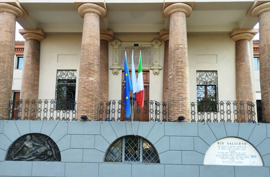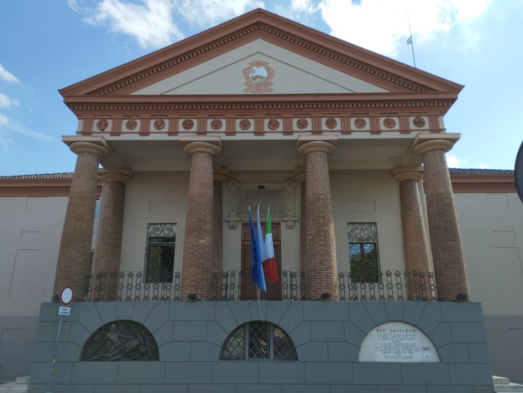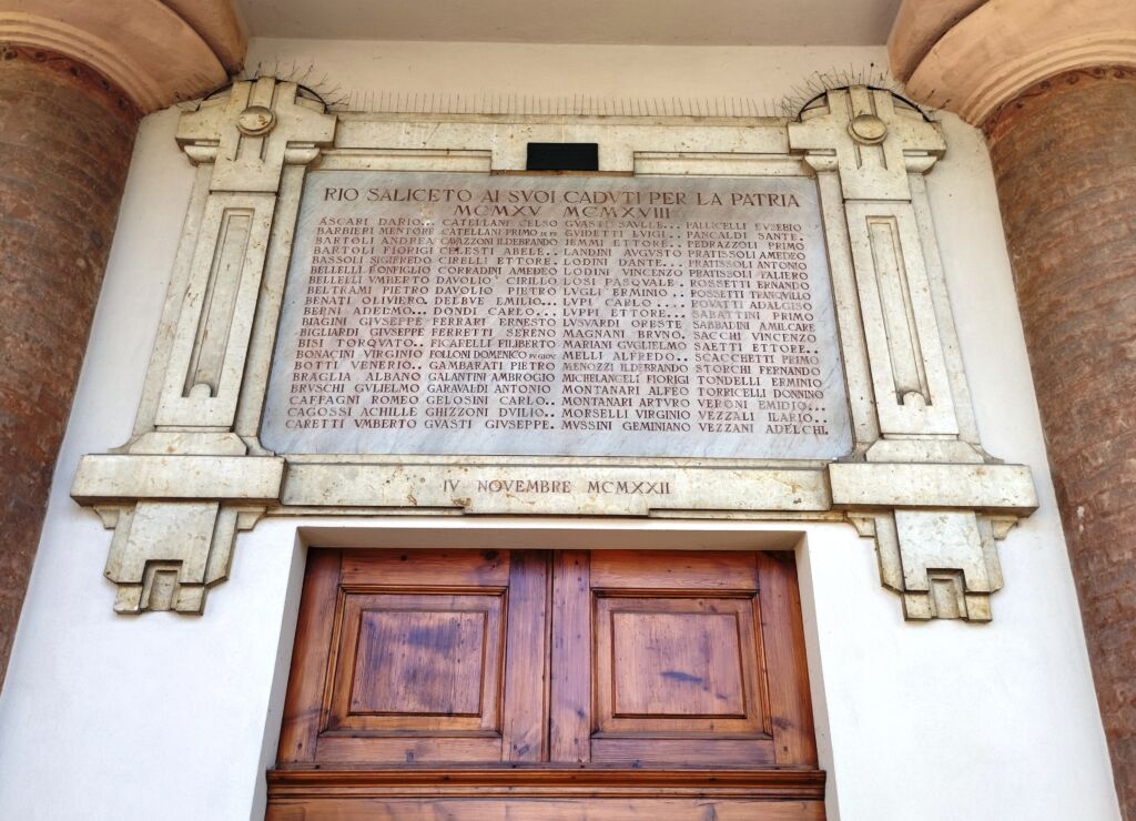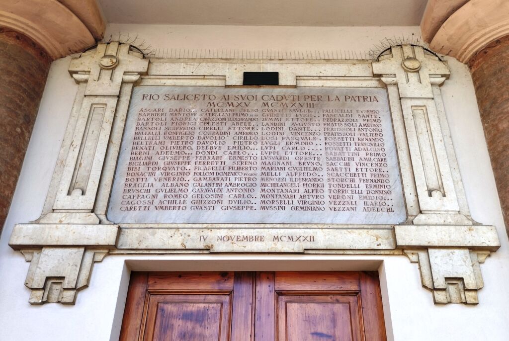 Lapide commemorativa posta sulla facciata del Municipio dalla comunità di Rio Saliceto per ricordare gli 80 concittadini caduti durante la prima guerra mondiale.