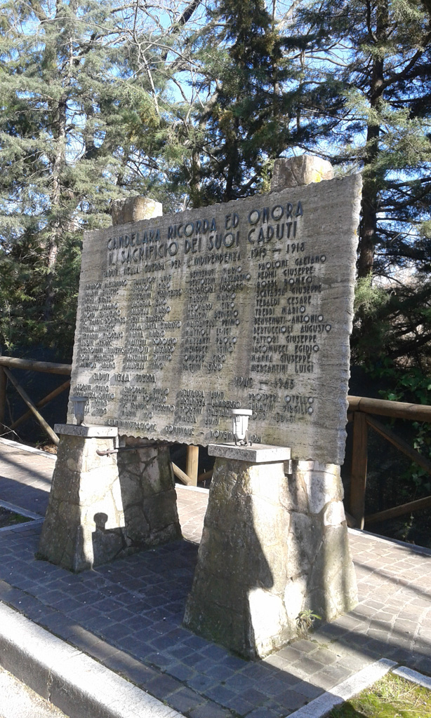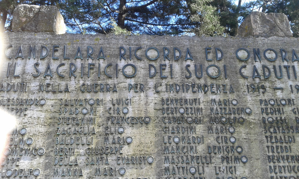 - CANDELARA RICORDA E ONORA/ IL SACRIFICIO DEI SUOI CADUTI/ CADUTI NELLA GUERRA PER L'INDIPENDENZA 1915 -1918/ AMADORI ALESSANDRO/ BALDINI GIUSEPPE/ BERTI ENRICO/ BERTULLI ADAMO/ BIONDI GUGLIELMO/ DE GRANDIS DOMENICO/ FRULLA GIUSEPPE/ GENNARI FILODELFO/ LISOTTI CESARE/ PIERGIOVANNI GIUSEPPE/ ROSSI FRANCESCO/ SALVATORI ADAMO/ SALVATORI LUIGI/ SPADONI SIRO/ STEFANINI FRANCESCO/ ZAGALIA ELIO/ BALDELLI MARIO/ BERTI GIUSEPPE/ DELLA SANTA EVARISTO/ MANNA MARIO/ MATTEINI RODOLFO/ PEDINOTTI LAZZARO/ BACCHIANI QUINTO/ BALDELLI TIMO/ BENVENUTI MARIO/ BERTOZZINI NAZZARENO/ CAPATORI ADOLFO/ GIARDINI MARIO/ LEONARDI CIRO/ MANCINI BENIGNO/ MASSARELLI PRIMO/ MATTIOLI LUIGI/ MAZZANTI PAOLO/ MENGUCCI IGINO/ ONDEDEI CIRO/ PAGNINI CIRO/ PAOLINI GAETANO/ PEDINI GIUSEPPE/ ROSSI ROMEO/ SCATASSA GIUSEPPE/ TEBALDI CESARE/ TREBBI MARIO/ BENVENUTI ANTONIO/ BERTUCCIOLI AUGUSTO/ FATTORI GIUSEPPE/ IACOMUCCI EGIDIO/ MANNA GIUSEPPE/ MERCANTINI LUIGI.