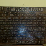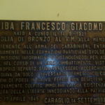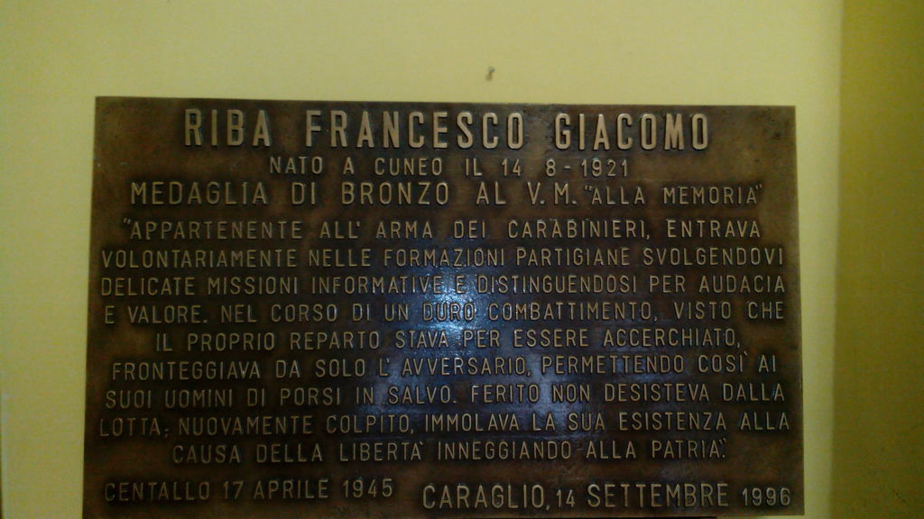 Lapide d’intitolazione della Caserma al Carabiniere Francesco Giacomo Riba, caduto il 17 aprile 1945 a Centallo, decorato di Medaglia di Bronzo al Valor Militare alla memoria. Presenta iscrizioni in rilievo.