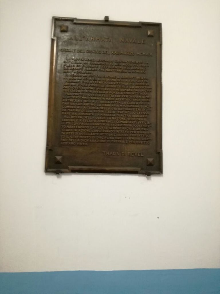 Lapide riportante l’ordine del giorno del 21 Marzo 1919 redatto dall’ammiraglio Thaon di Revel e indirizzato all’armata navale. E’ sagomata, quasi a forma di pergamena, ripiegata agli angoli dove figurano i perni quadrangolari. E’ collocata all’interno dell’Istituto Nautico “C.Duilio” di Messina.