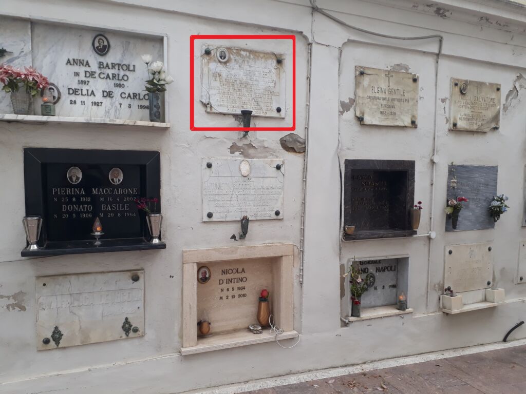 - La lapide è collocata sulla tomba nel colombario del campo 2S lungo il viale sinistro del cimitero che, partendo dall'ingresso di Piazzale S. Anna, porta all'ingresso di Via E. Ianni.