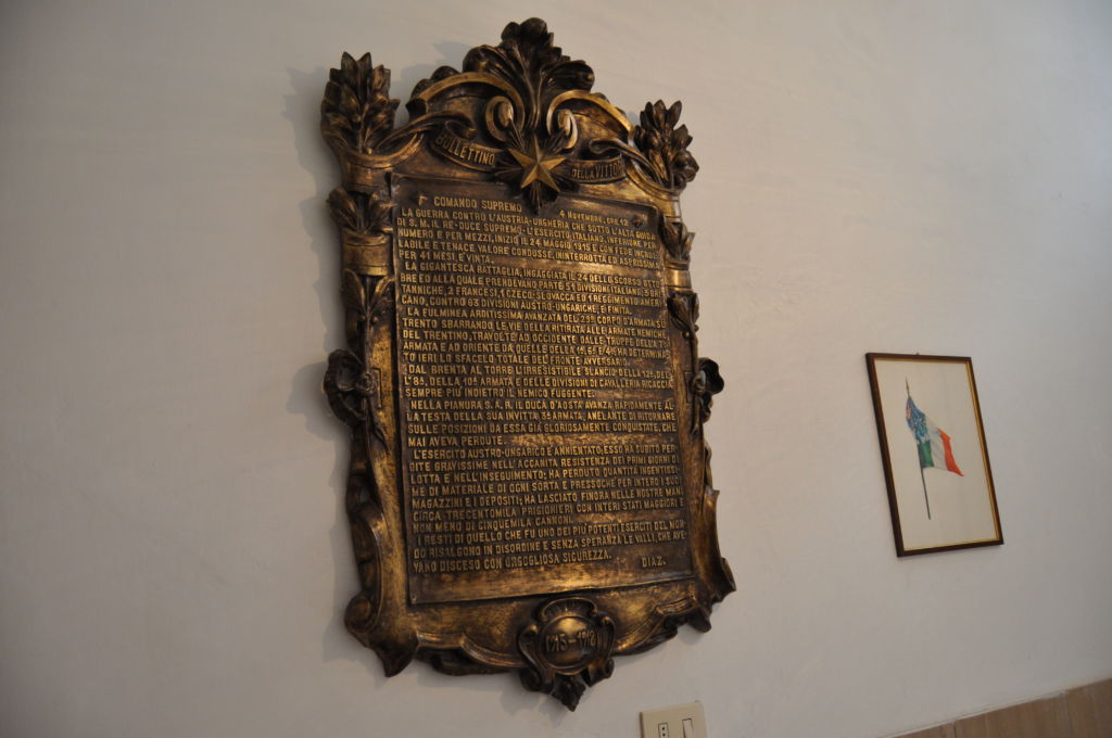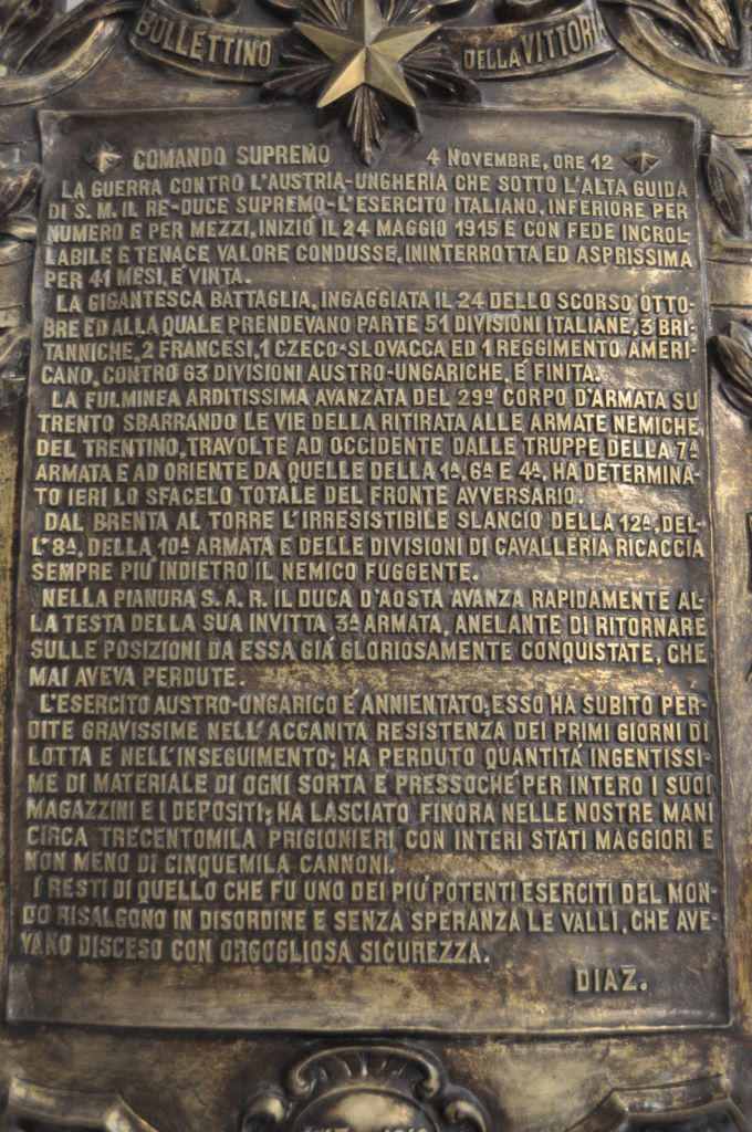 - Per commemorare la vittoria della prima guerra mondiale, nell'ambito delle celebrazioni organizzate in tutta Italia a partire dal 1919, vennero distribuite nei municipi e nelle caserme le lapidi riportanti il testo dell'annuncio della vittoria italiana e della disfatta dell'esercito austriaco. Per le lastre venne utilizzato il metallo fuso dei pezzi d'artiglieria catturati al nemico.