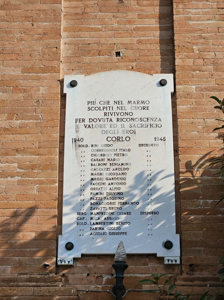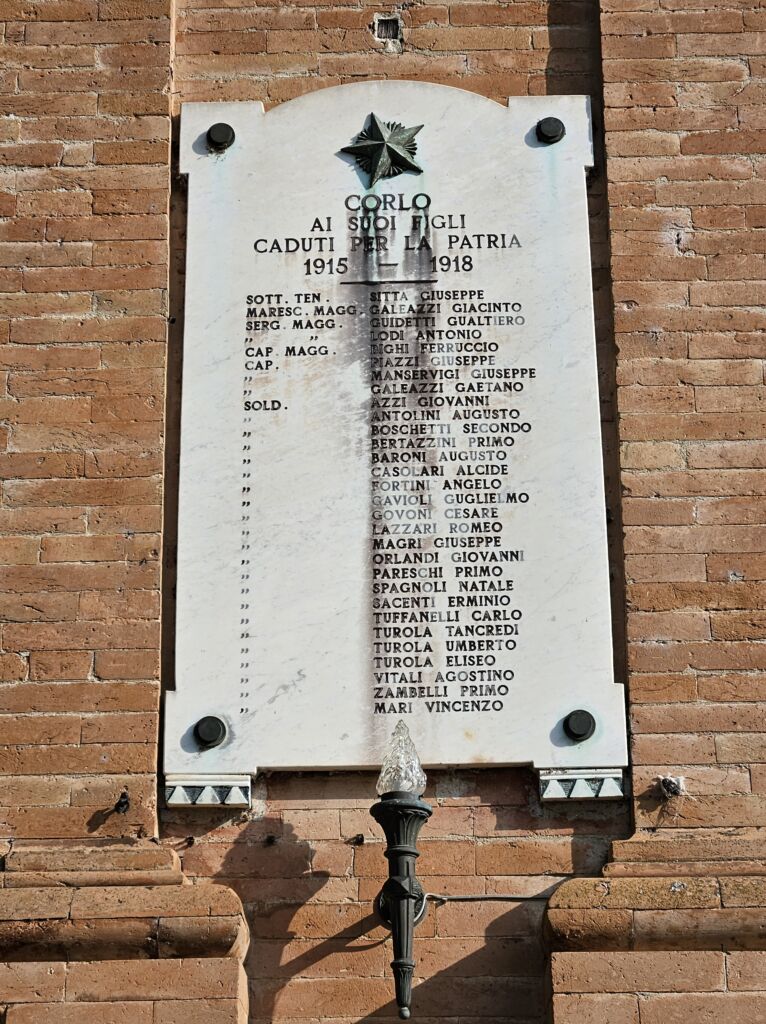 Una lapide con elemento in rilievo e una lastra, affisse sulla facciata della chiesa di San Clemente, ricordano a Corlo, frazione di Ferrara, i Caduti nella prima e seconda guerra mondiale. La lapide, a sinistra guardando la facciata della chiesa, riporta i nominativi ordinati per grado e per ordine alfabetico. Nella lastra, a destra, i Caduti della seconda guerra mondiale sono suddivisi in “deceduti” e “dispersi” e poi ordinati per grado e nome.