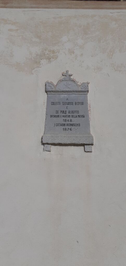 Sulla stessa facciata sud è collocata anche una lapide più antica che risale al 1876. Ricorda la Rivoluzione del 1848 di Pier Fortunato Calvi ed è dedicata ai due Caduti di Tai di Cadore. Questa l'iscrizione: