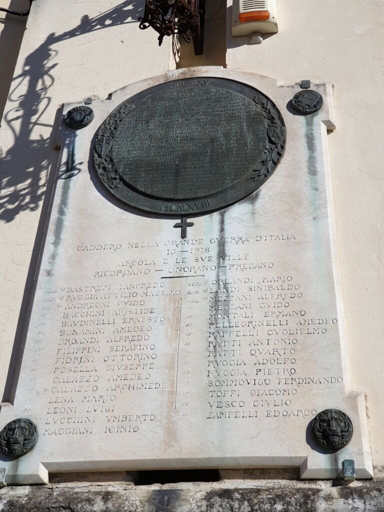 - La lapide, situata in piazza Luciano Picedi, davanti al Santuario N.S. degli Angeli, ricorda i cittadini di Arcola caduti durante la Prima Guerra Mondiale.