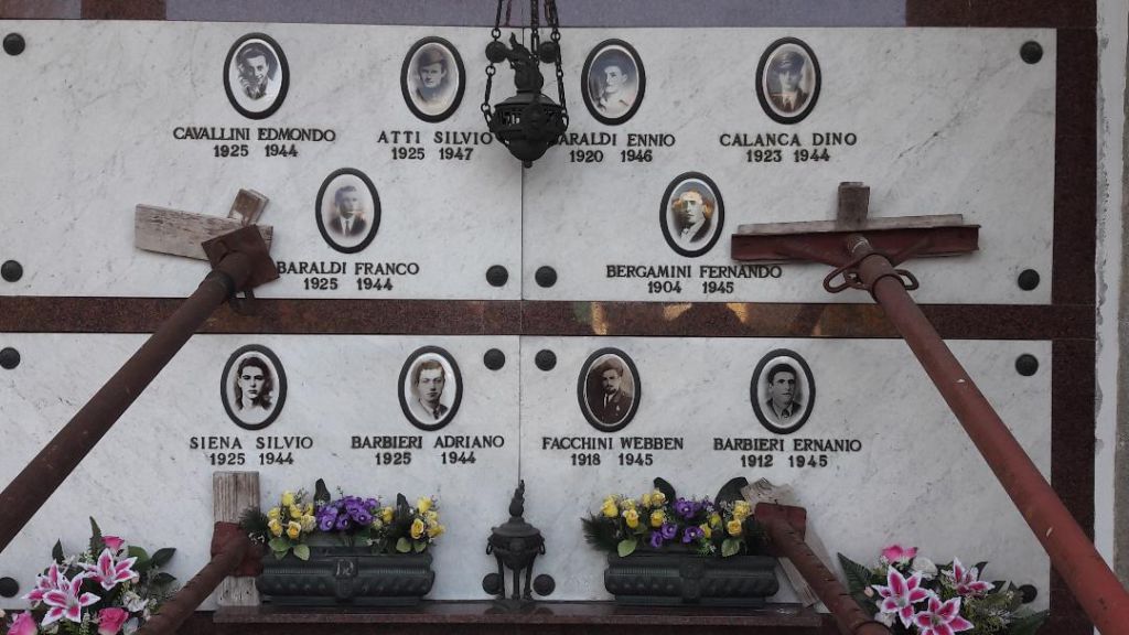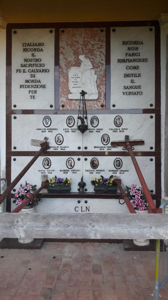 Lapide che riporta i nomi di dieci partigiani nati nella zone di Medolla e caduti combattendo o per cause di guerra, situata nel Cimitero comunale a  monito e ricordo per le genti, del sacrificio dei caduti lì sepolti.