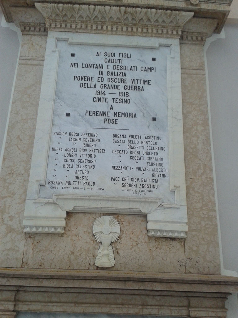 - Ai suoi figli caduti nei lontani e desolati campi di Galizia povere ed oscure vittime della Grande Guerra 1914-1918 Cinte Tesino a perenne memoria pose.