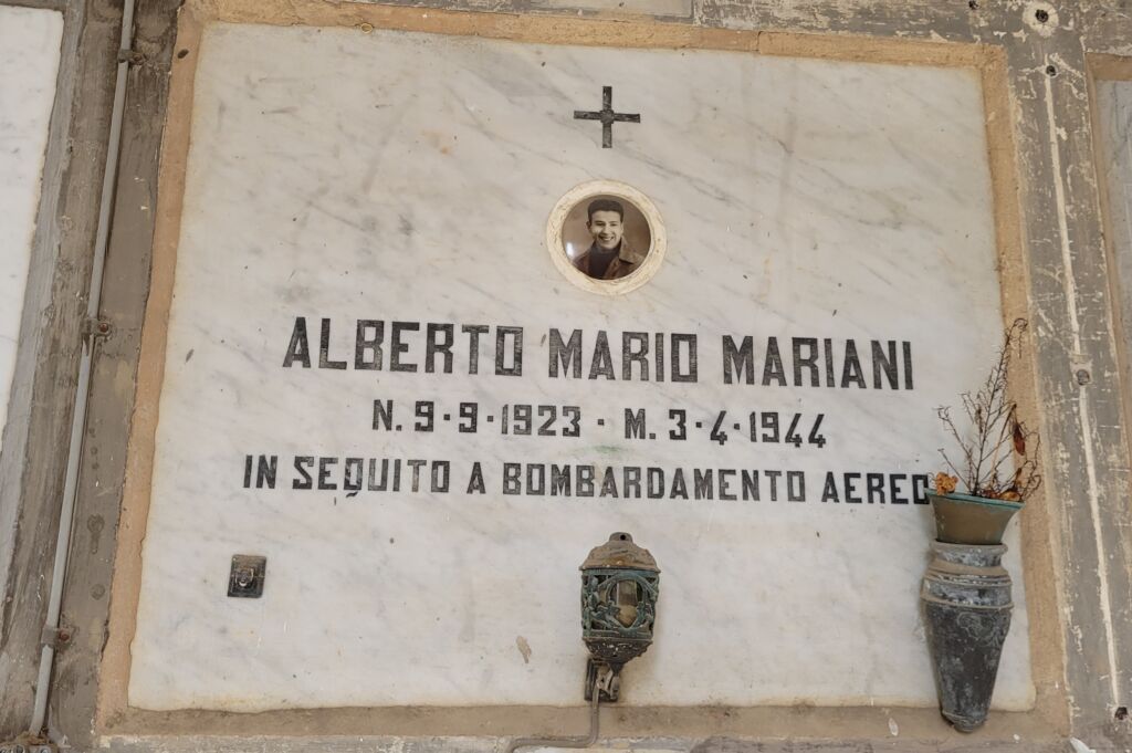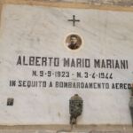 Lapide sepolcrale di Alberto Mario Mariani (Macerata, 09.09.1923-03-04-1944), vittima civile del primo bombardamento aereo alleato su Macerata. Il manufatto è di forma rettangolare, in marmo chiaro, con iscrizioni, simbolo e foto in ceramica; in basso, al centro, è applicata una lampada votiva in bronzo, a destra un portafiori, sempre in bronzo.