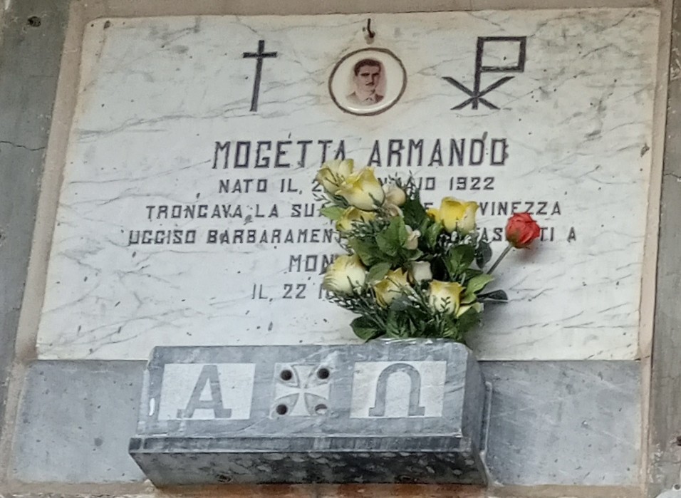 - Armando Mogetta riposa accanto ai compagni Nazareno Bartoli, Armando Pettinari, Bruno Principi, come lui di Villa Potenza di Macerata, e Primo Stacchietti, di Santa Maria in Selva di Treia. Sulle loro lapidi si trova replicato il medesimo epitaffio.