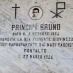 Lapide sul loculo del “martire di Montalto” Bruno Principi (Treia MC, 02.10.1924 – Cessapalombo MC, 22.03.1944). Il manufatti è di forma rettangolare, in marmo bicolore, con iscrizione e simboli incisi e dipinti, foto in ceramica; al centro, in basso, vi è applicato un supporto tripartito in marmo per fiori e lampada votiva su cui sono riportati altri simboli.