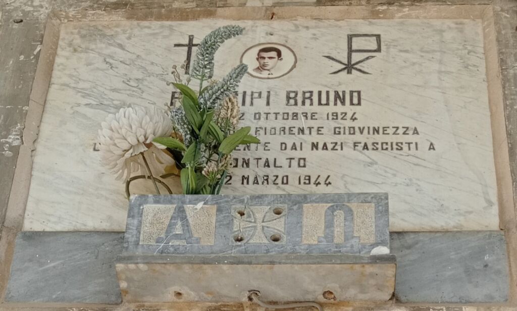 Lapide sul loculo del “martire di Montalto” Bruno Principi (Treia MC, 02.10.1924 – Cessapalombo MC, 22.03.1944). Il manufatti è di forma rettangolare, in marmo bicolore, con iscrizione e simboli incisi e dipinti, foto in ceramica; al centro, in basso, vi è applicato un supporto tripartito in marmo per fiori e lampada votiva su cui sono riportati altri simboli.
