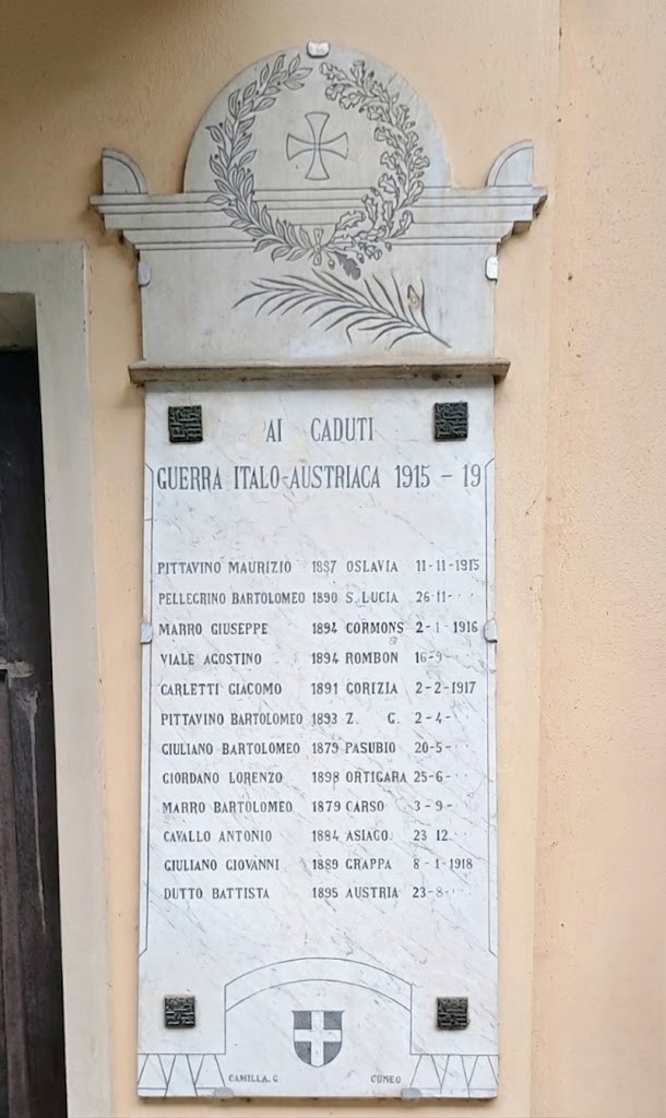 Sulla sommità di quella che commemora i Caduti della prima guerra mondiale è presente un bassorilievo con una croce inscritta in una corona d'alloro e di quercia, sopra una palma della vittoria. In basso si legge la scritta CAMILLA G. CUNEO, probabilmente la ditta di marmi che disegnò e preparò il cimelio, con al centro uno stemma a croce bianca in campo scuro, probabilmente lo stemma del Piemonte (croce bianca in campo rosso). Questi ultimi dettagli basali sono incorniciati da linee spezzate, e sui lati delle scritte da linee rette.