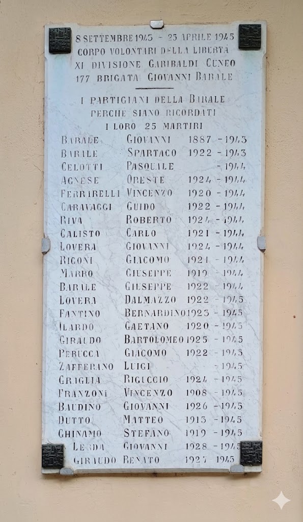 - BARALE GIOVANNI: nato a Gaiola il 25 gennaio 1887, cadde a Castellar di Boves il 1° gennaio 1944.