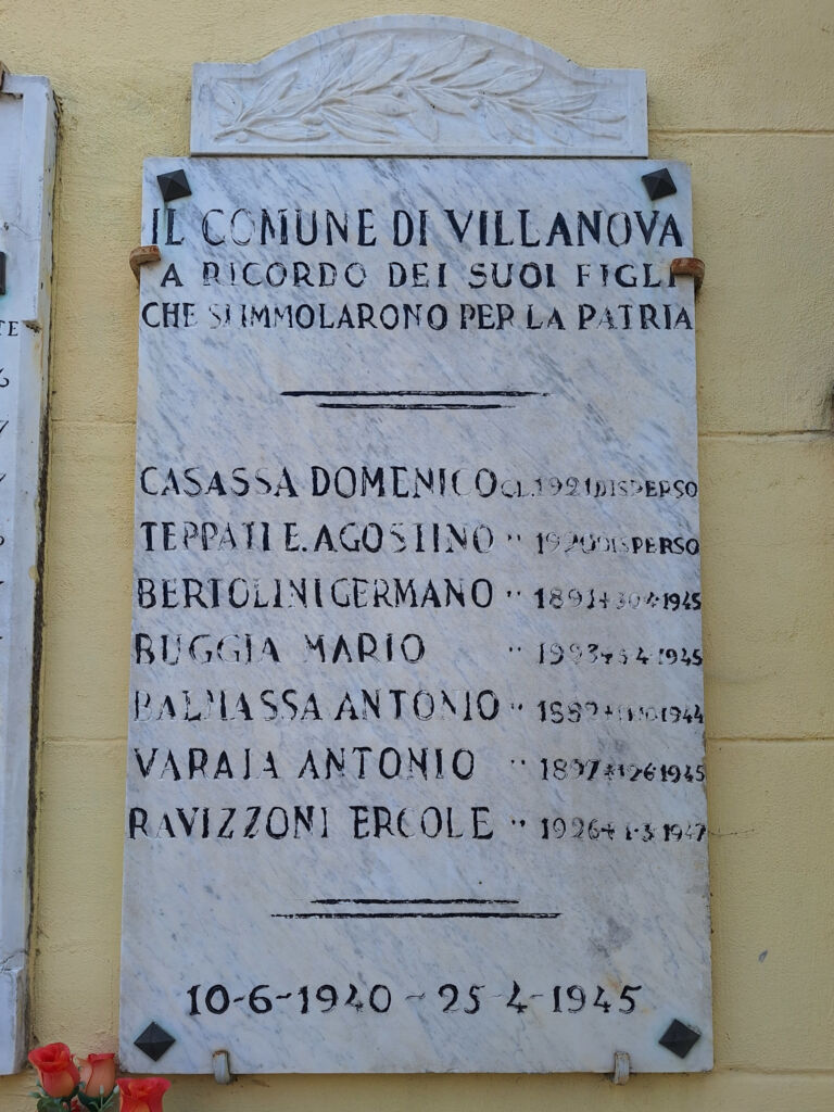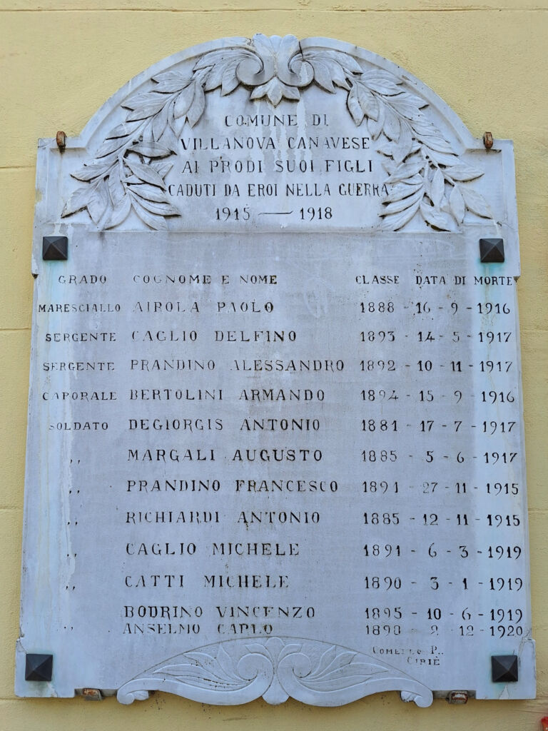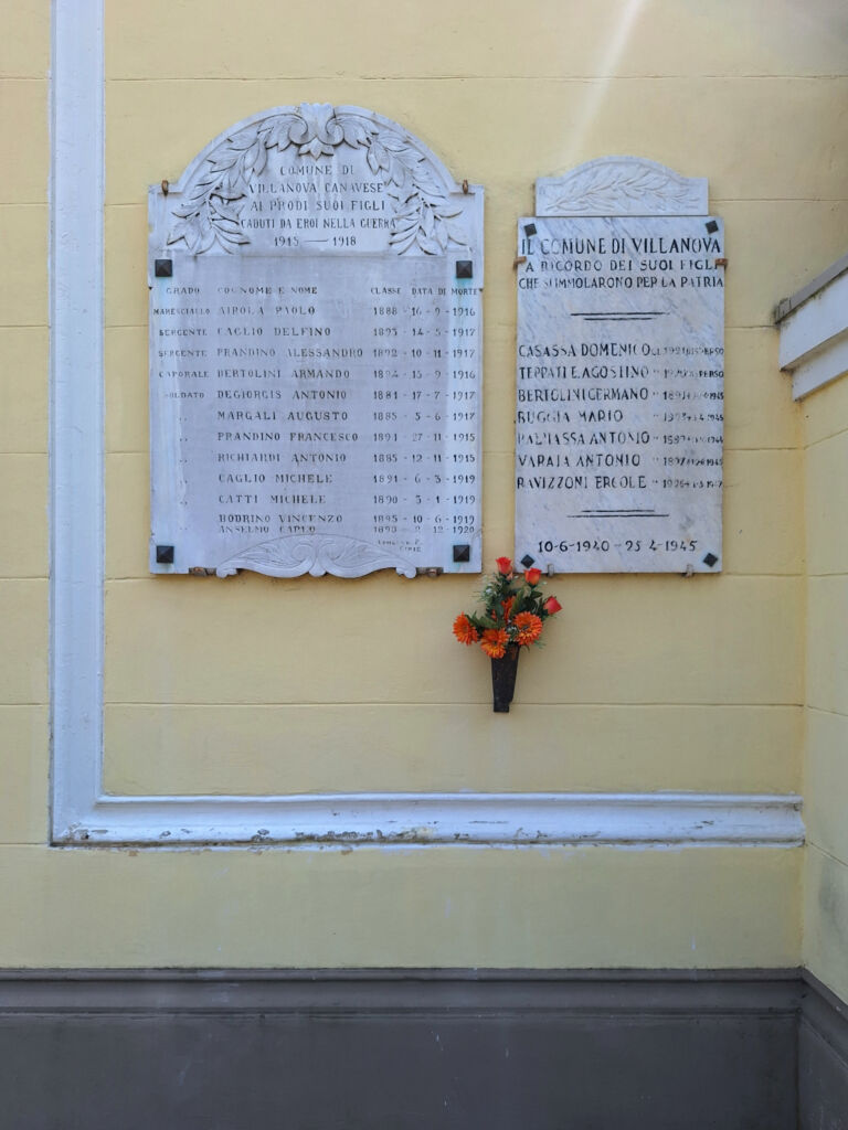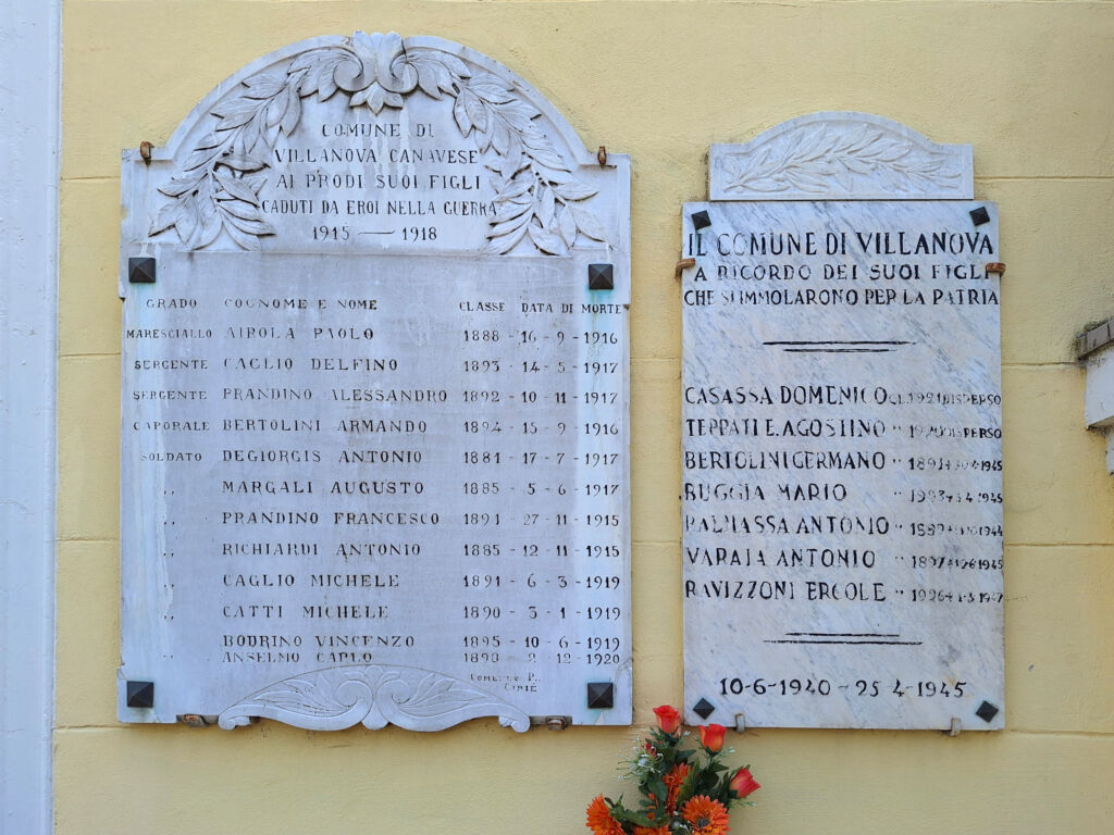 - Le fotoceramiche dei Caduti e Dispersi di Villanova Canavese, 12 nella prima guerra mondiale e 9 nella seconda guerra mondiale, di cui due non elencati qui nella seconda lapide, sono visibili sui cippi posti ai lati della scalinata del Monumento ai Caduti di Villanova Canavese, posto a breve distanza nel piazzale adiacente il Cimitero.