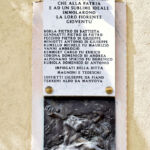 - Cornice in pietra; lastra orizzontale in marmo con incisioni in nero. Lastra verticale in marmo con incisioni in nero; coperture rotonde in ottone dei supporti; bassorilievo in bronzo. Presenti faretti di illuminazione e supporti per bandiere e corone floreali.