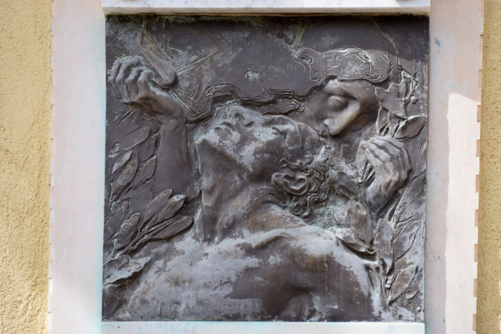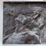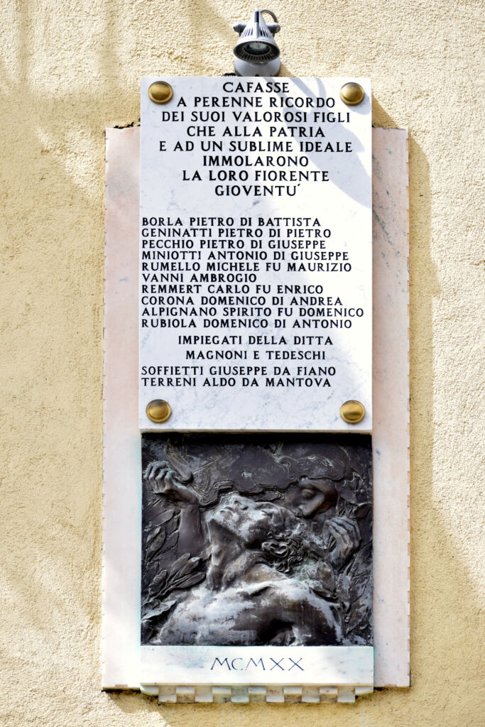 - Nel bassorilievo: il Caduto, la Patria, fronde di quercia e alloro, la fiamma eterna.