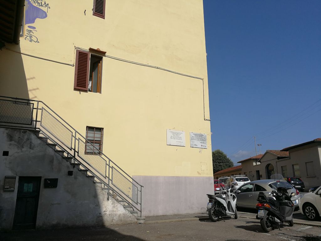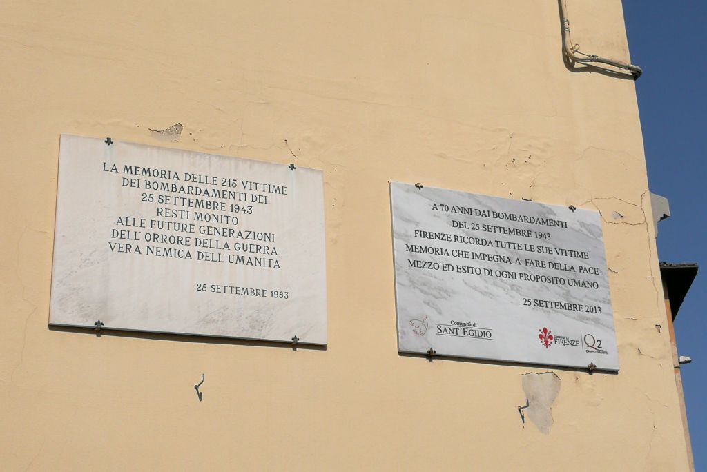 La lastra è dedicata alle vittime del bombardamento aereo operato dagli Alleati il 25 Settembre 1943. su Firenze. L’azione investì principalmente i quartieri adiacenti lo scalo ferroviario del Campo di Marte, vero obiettivo del raid. Si tratta di una lastra rettangolare di marmo apposta sul fianco di un palazzo. E’ sostenuta da quattro perni di bronzo a forma di giglio. Nell’epigrafe sono presenti, oltre la data, il loghi dei committenti della lapide: la colomba con ramoscello d’olivo (Comunità di Sant’Egidio) ed il giglio (simbolo di Firenze). I caratteri e i simboli dell’epigrafe sono incisi e riempiti con vernice di color nero; fanno eccezione il giglio e la “Q” (che sta per Quartiere, in questo caso il 2) che sono colorati in rosso. Posta nel 70° Anniversario del tragico avvenimento, ha affiancato quella collocata il 25 Settembre 1983.