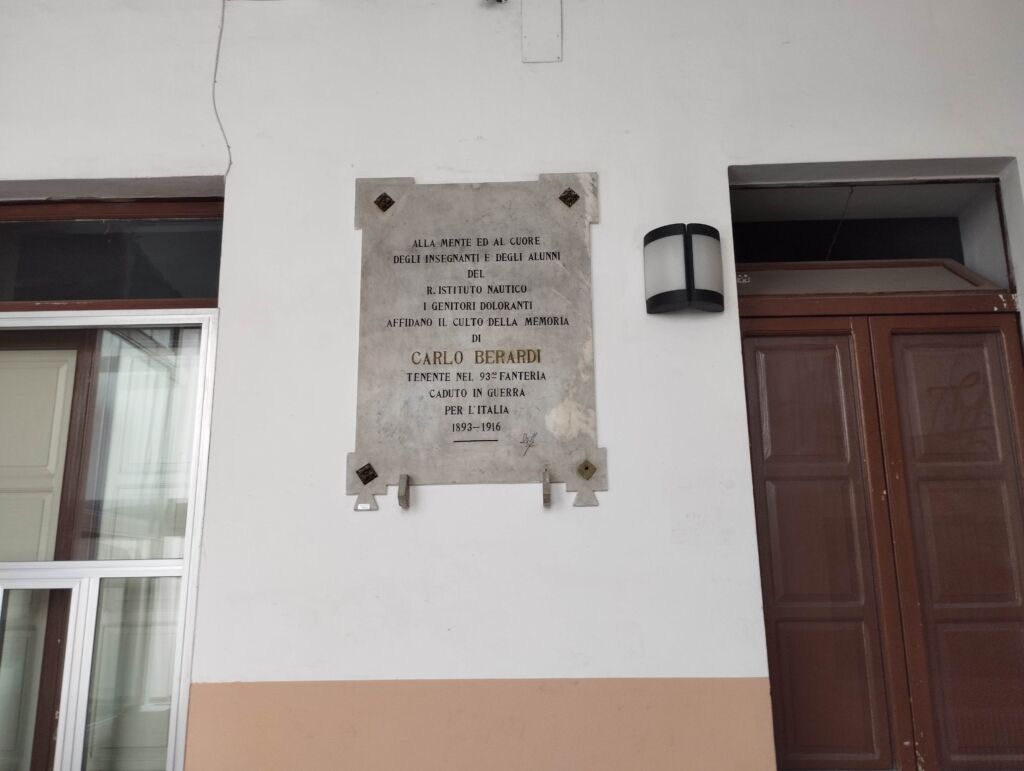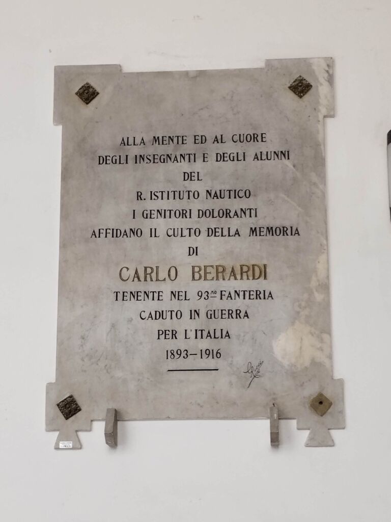 La lastra è collocata nell’edificio che un tempo ospitò il Regio Istituto Nautico di Ortona. Fu donata all’Istituto dai genitori di Carlo Berardi in modo che gli insegnanti e gli alunni ne mantenessero viva la memoria. Durante la Grande Guerra Carlo Berardi fu sottotenente del 93° fanteria e cadde il 21 gennaio 1916.
