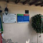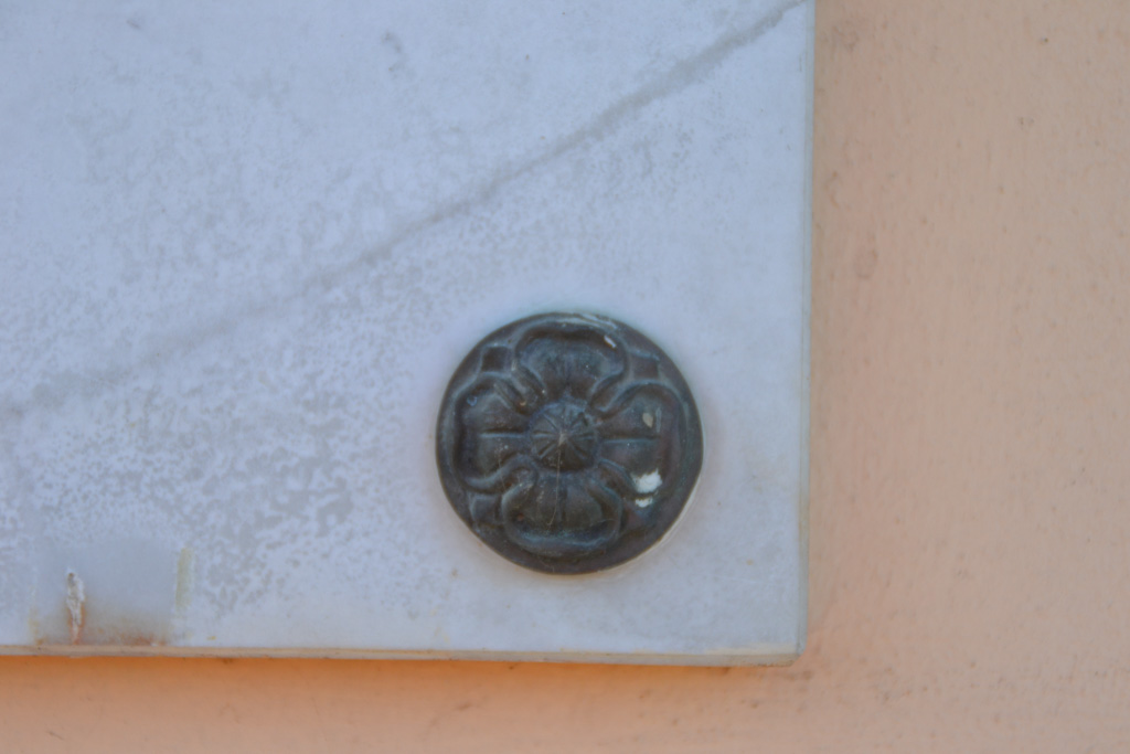 - Lastra di marmo con incise sopra delle scritte, nei quattro lati vi sono collocati quattro fiori di bronzo che fungono da supporto a parete. La nuova lastra con le indicazioni storiche è in materiale metallico.