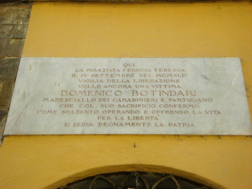La lastra è dedicata a Domenico Botindari, maresciallo del Reali Carabinieri in pensione e partigiano, qui caduto in combattimento contro le retroguardie tedesche il 4 Settembre 1944. Si tratta di una semplice lastra in marmo, di forma rettangolare, affissa sopra il portone di un palazzo di Via Vittorio Veneto. L’epigrafe reca incisi il nome del Caduto e la data di morte. I caratteri sono stati riempiti con vernice di color nero.