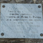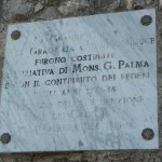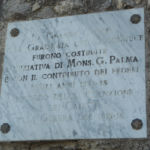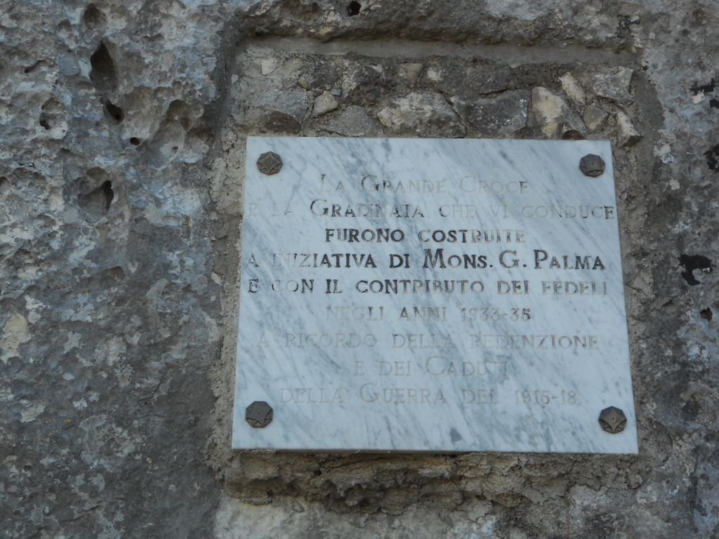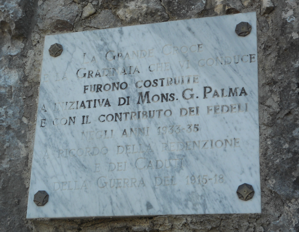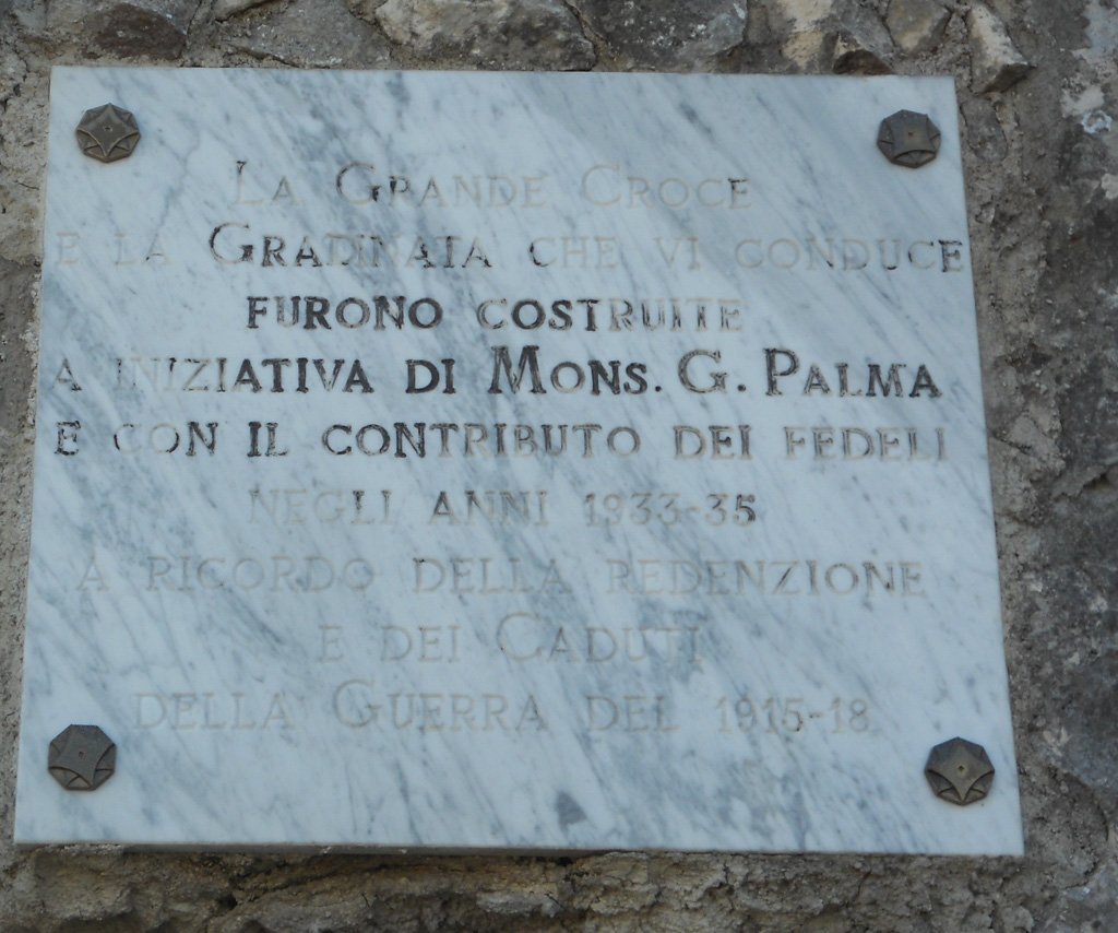 Lastra commemorativa in marmo, di forma quadrata, posta negli anni 1933-1935 a ricordo dei Caduti della prima guerra mondiale su iniziativa di Mons. G. Palma e con il contributo dei fedeli; è fissata al muro con borchie laterali di bronzo circolari. La lastra è collocata sul  lato destro roccioso della scalinata che dalla “Croce luminosa” giunge all’ingresso della Strada dei Colli, oggi intitolata Hermann Gmeiner.